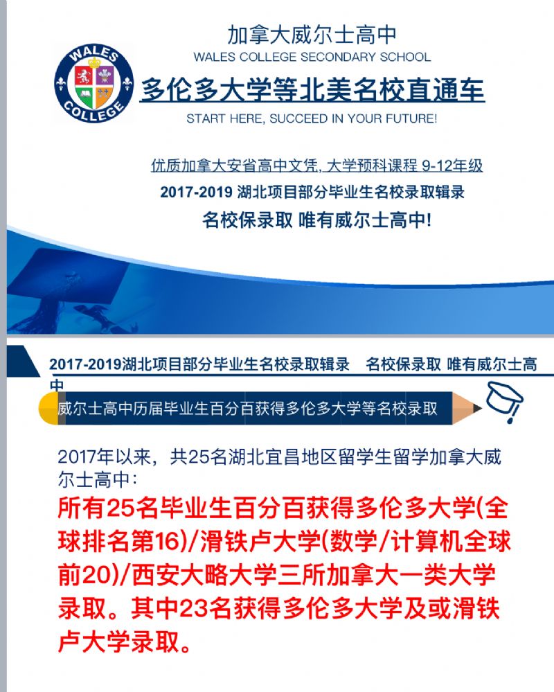 威爾士高中是加拿大多倫多著名本地高中,加拿大安大略省教育部注冊并通過嚴格審查評估,提供高質(zhì)量安省高中學分課程;威爾士高中為多倫多唯一SAT(美國高考)官方考試中心/ACT(美國高考)官方考試中心/IELTS雅思官方考試中心,威爾士高中聲譽卓越,國際認可,秉承國際標準,構(gòu)建美加名校直升通道,歷屆畢業(yè)生百分百升入美加英澳等世界名校!