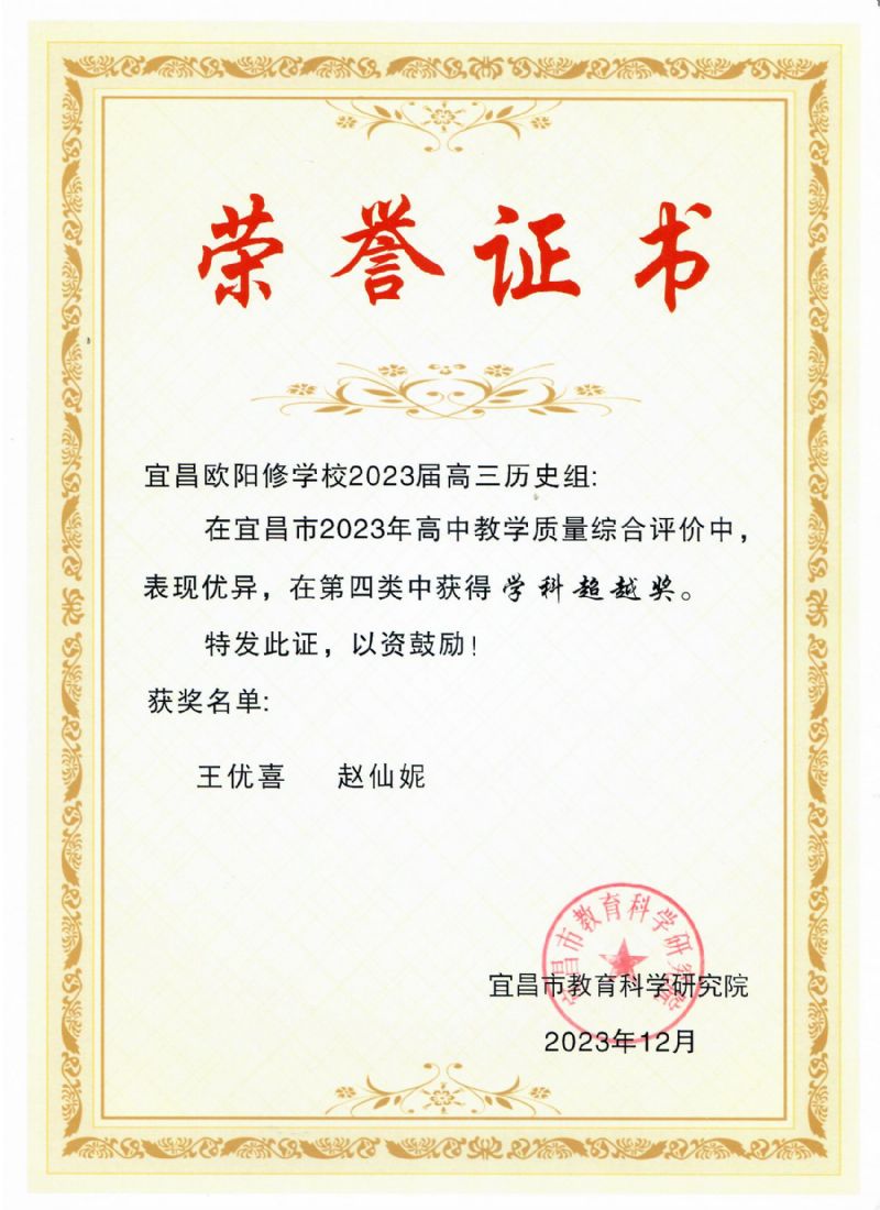 在宜昌市2023年高中教學(xué)質(zhì)量綜合評價中,我校高三歷史教研組表現(xiàn)優(yōu)異,榮獲同類學(xué)校一等獎和學(xué)科超越獎。