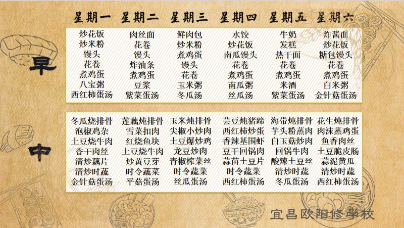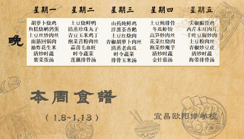 宜昌歐陽(yáng)修學(xué)校每周食譜(1月8日至1月13日)