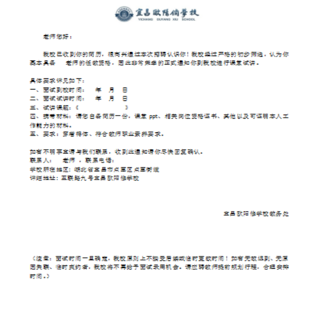 二、應(yīng)聘教師將收到以下書(shū)面通知材料: