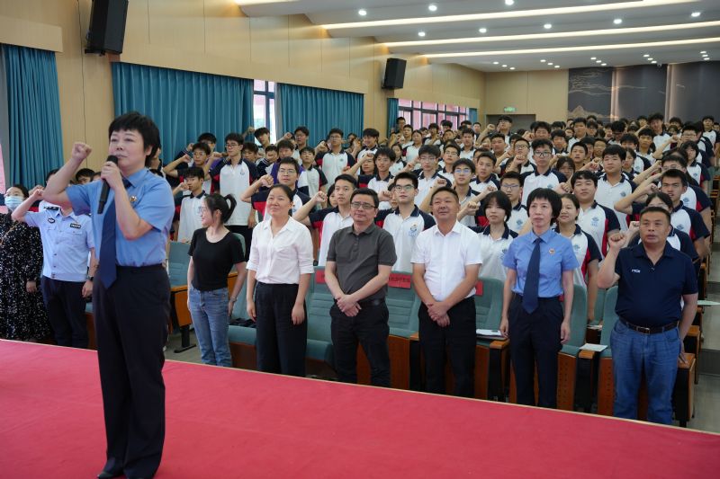 在陳露檢察官的帶領(lǐng)下,全體同學(xué)高舉右拳,莊嚴(yán)宣誓: