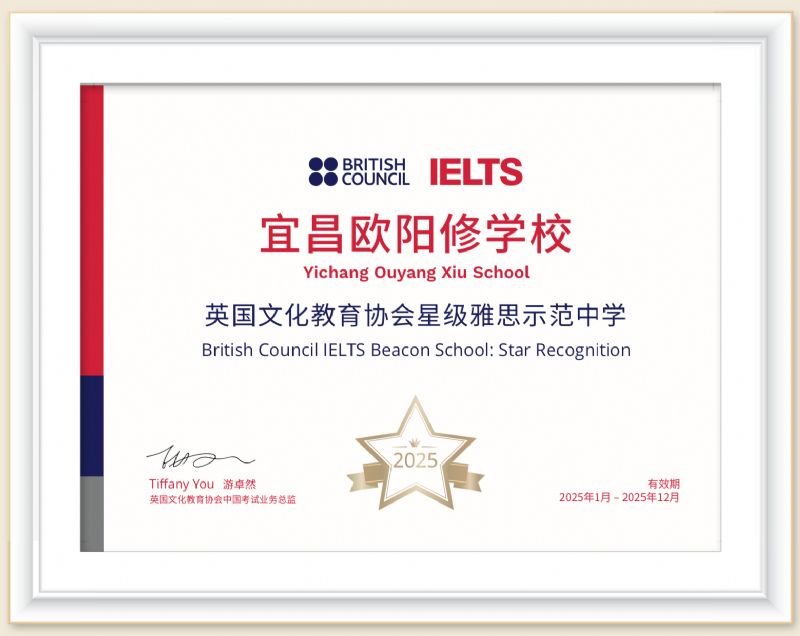 宜昌歐陽(yáng)修學(xué)?,F(xiàn)設(shè)有普通高中和國(guó)際高中。20多年來(lái),學(xué)校先后獲得“宜昌市區(qū)域現(xiàn)代化先進(jìn)學(xué)?!?、“宜昌市優(yōu)秀民辦學(xué)?!钡戎T多榮譽(yù)稱號(hào),是宜昌市唯一被英國(guó)文化教育協(xié)會(huì)BritishCouncil授牌的“星級(jí)雅思示范中學(xué)”、“雅思教師培訓(xùn)基地”和“Aptis普思考點(diǎn)示范學(xué)校”、“三峽大學(xué)外國(guó)語(yǔ)學(xué)院學(xué)科教學(xué)英語(yǔ)研究生工作站”。2023年7月,中國(guó)工程院院士,香港中文大學(xué)(深圳)校長(zhǎng)徐楊生先生為宜昌歐陽(yáng)修學(xué)校題寫(xiě)校名。